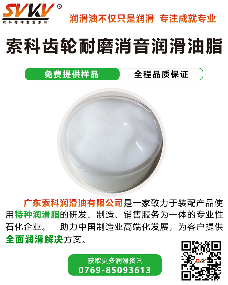 廣東索科潤滑油有限公司是一家致力于裝配產(chǎn)品使用特種潤滑脂的研發(fā)、生產(chǎn)、定制、服務為一體的專業(yè)性石化企業(yè)。致力為制造業(yè)客戶,提供專業(yè)的選油方案,協(xié)助客戶解決產(chǎn)品裝配時的潤滑難題,還可根據(jù)客戶特殊需求訂做適合的潤滑油品。有效提高產(chǎn)品性能、減低維護成本,索科助力制造業(yè)高端化發(fā)展! 主要產(chǎn)品有: 齒輪消音潤滑脂|高溫潤滑脂|食品級潤滑脂|齒輪消音潤滑脂|防水潤滑脂 導電油脂|軸承油|硅油|干性皮膜潤滑劑|低溫潤滑脂|阻尼脂|全氟油脂
