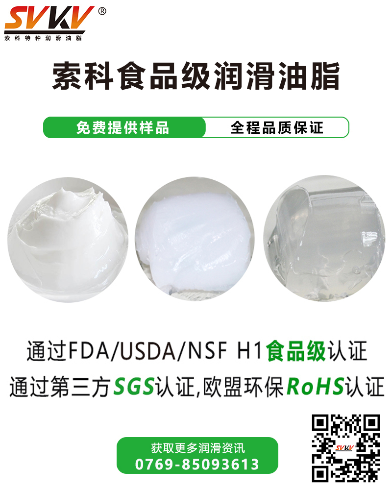 索科SVKV系列食品級(jí)潤(rùn)滑油脂符合美國(guó)FDA和USDA的法規(guī)標(biāo)準(zhǔn),并通過(guò)NSF H-1食品級(jí)認(rèn)證,保障食品安全。