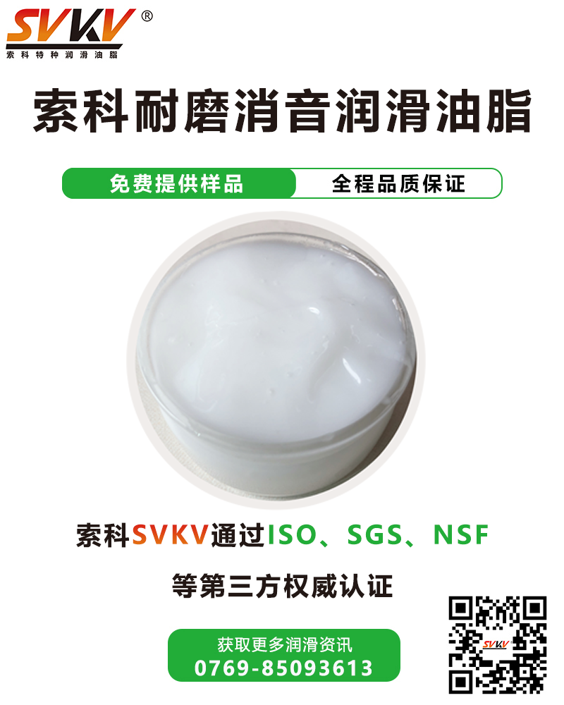 廣東索科潤滑油有限公司是一家致力于裝配產品使用特種潤滑脂的研發、生產、定制、服務為一體的專業性石化企業。致力為制造業客戶,提供專業的選油方案,協助客戶解決產品裝配時的潤滑難題,還可根據客戶特殊需求訂做適合的潤滑油品。有效提高產品性能、減低維護成本,索科助力制造業高端化發展! 主要產品有: 齒輪消音潤滑脂|高溫潤滑脂|食品級潤滑脂|齒輪消音潤滑脂|防水潤滑脂 導電油脂|軸承油|硅油|干性皮膜潤滑劑|低溫潤滑脂|阻尼脂|全氟油脂