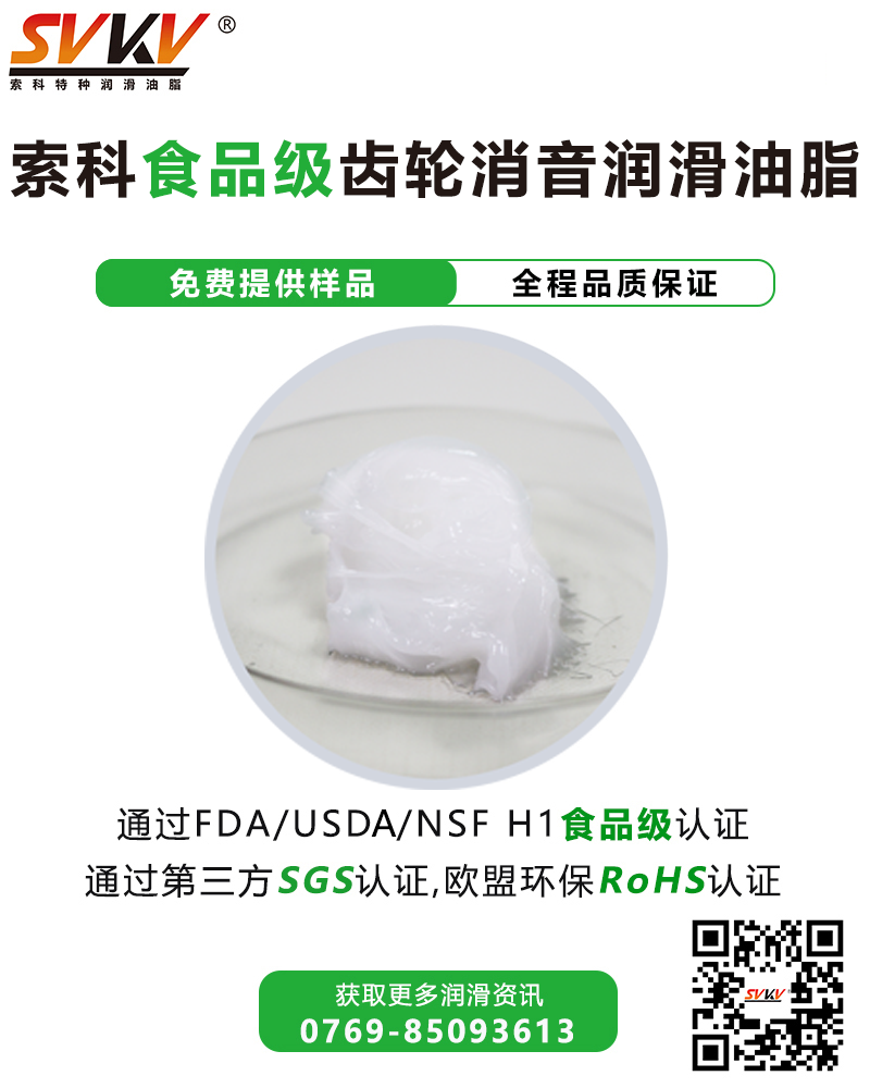 索科SVKV食品級齒輪消音潤滑油脂選用食品級的基礎油和無毒無害的添加劑精制而成,專為食品加工及醫療設備而研制。索科SVKV食品級齒輪消音潤滑油脂符合美國FDA和USDA的法規和標準,并通過美國NSF H-1食品級認證,確保食品設備的衛生、安全。